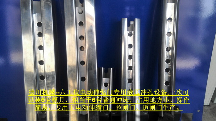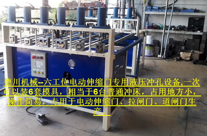 六工位電動伸縮門專用液壓沖孔設備,一次可以裝6套模具,相當于6臺普通沖床,占用地方小,操作簡易,專用于電動伸縮門、拉閘門、道閘門生產。...