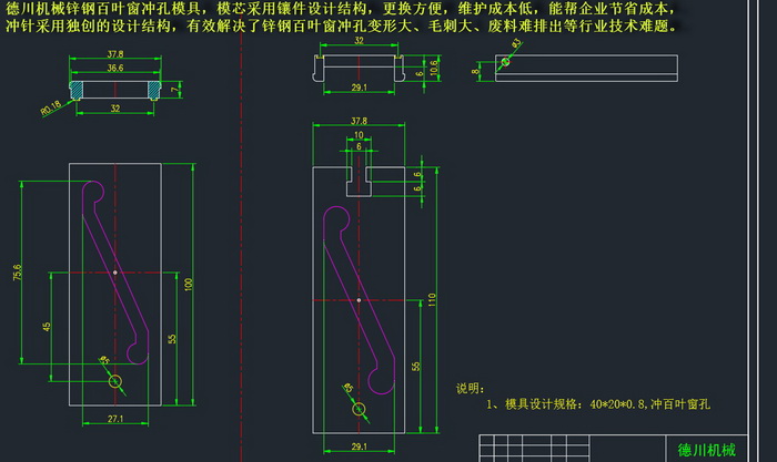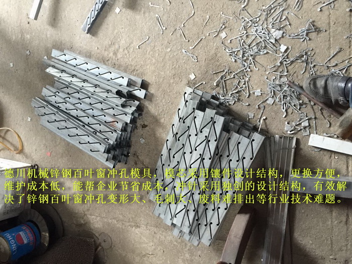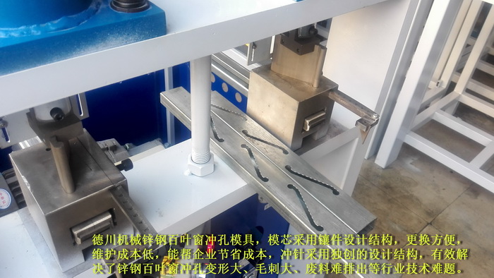 德川機械鋅鋼百葉窗沖孔模具,模芯采用鑲件設計結構,更換方便,維護成本低,能幫企業節省成本,沖針采用獨創的設計結構,有效解決了鋅鋼百葉窗沖孔變形大、毛刺大、廢料難排出等行業技術難題。